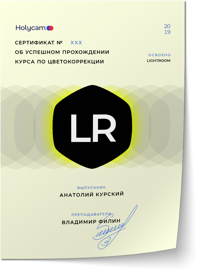 Каждый выпускник после обучения Lightroom получает подтверждающий документ о завершении курса Holycam. Именной сертификат расскажет о степени вашей экспертности в ретуши фотографий и убедит будущих клиентов.